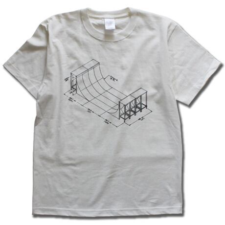 スケートランプの設計図をデザインに落とし込みました。シンプルなデザインですので何にでも合わせ易く、スケートボードが好きで他と違う物を探していた人にぴったりです。寸法も細かく描かれています。